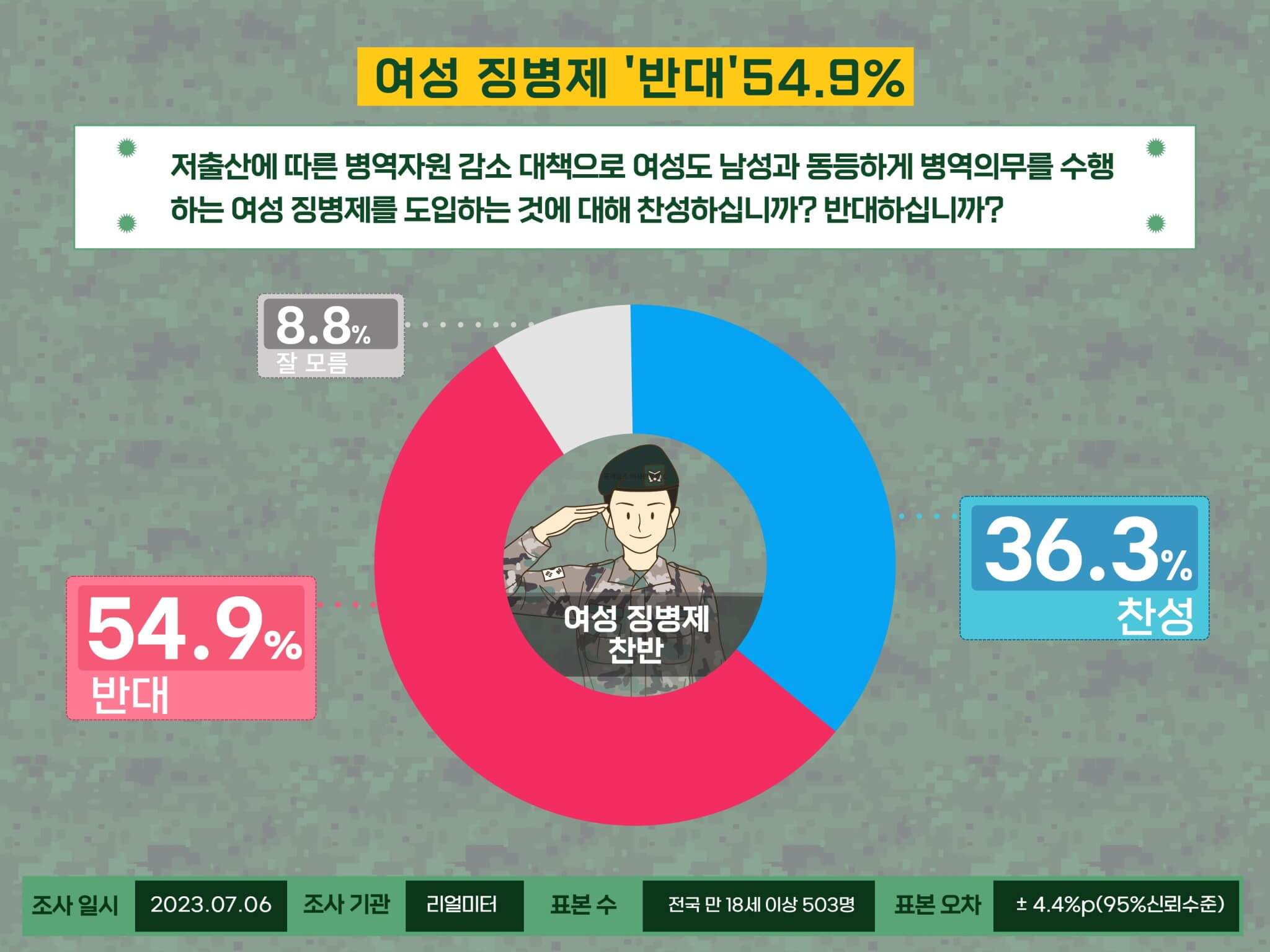 여성 징병제 도입, ‘찬성’ 36.3% vs. ‘반대’ 54.9%