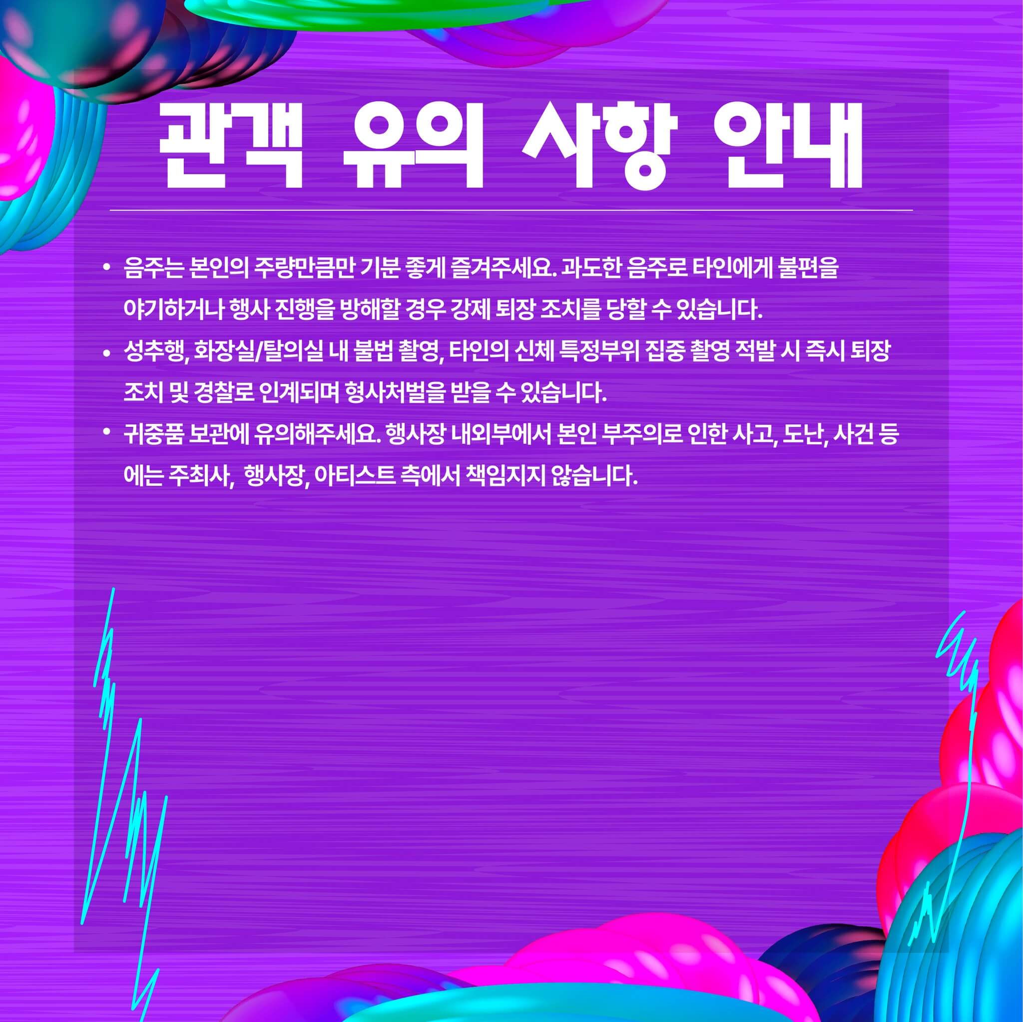 5. 음주는 본인의 주량만큼만 기분 좋게 즐겨주세요. 과도한 음주로 타인에게 불편을 야기하거나 행사 진행을 방해할 경우 강제 퇴장 조치를 당할 수 있습니다.