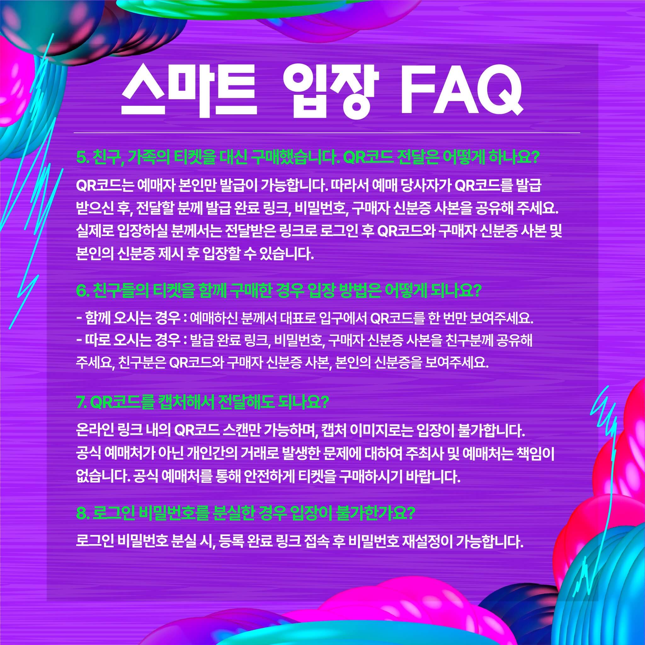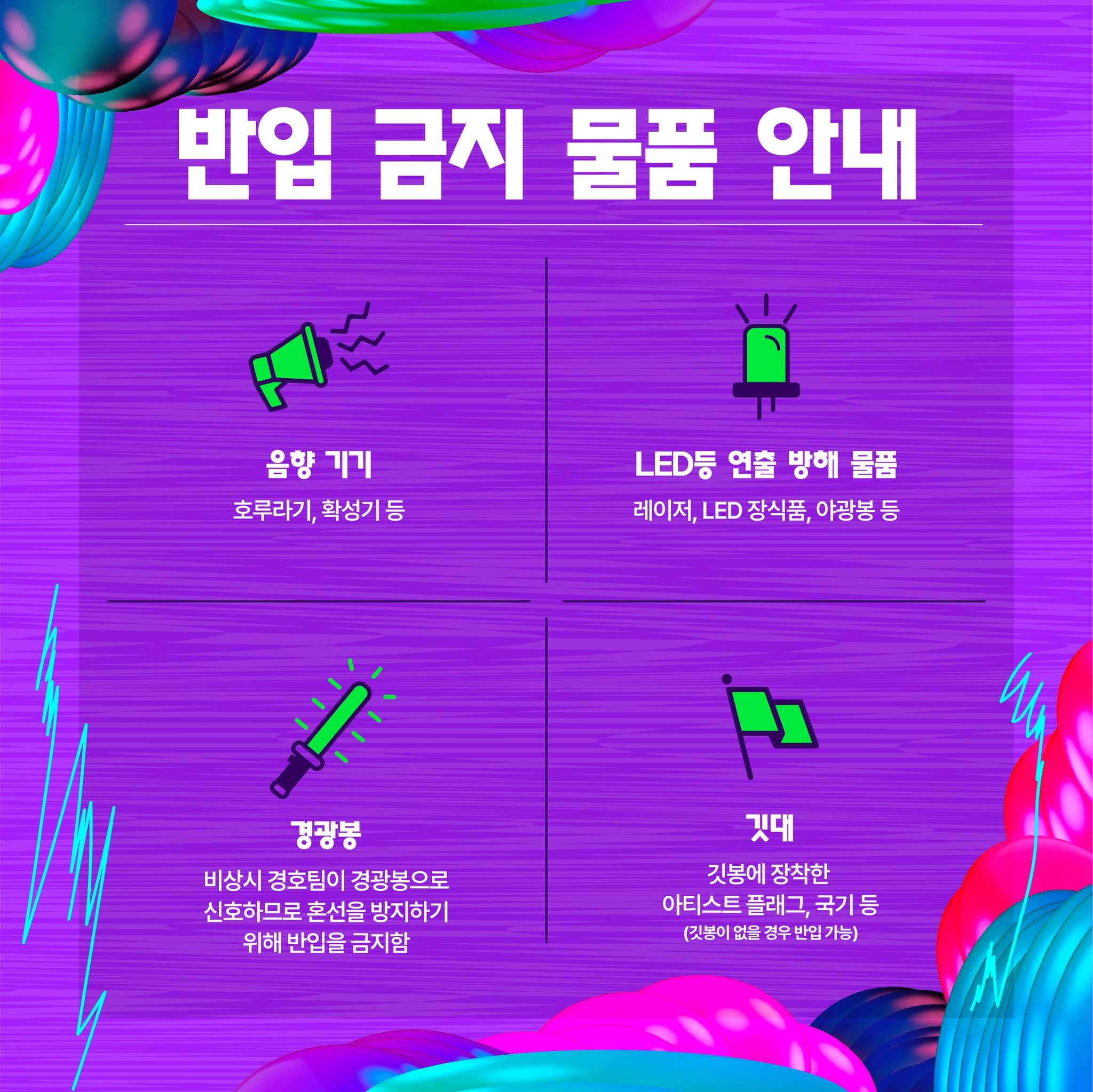 1. 공연장 내 호루라기 사용, 타인에게 불쾌감을 주는 행동, 주최사 판단 시 행사 진행에 심각하게 지장을 초래하는 행위 적발 시, 경고 조치 없이 퇴장될 수 있으며, 이로 인한 환불은 불가합니다.