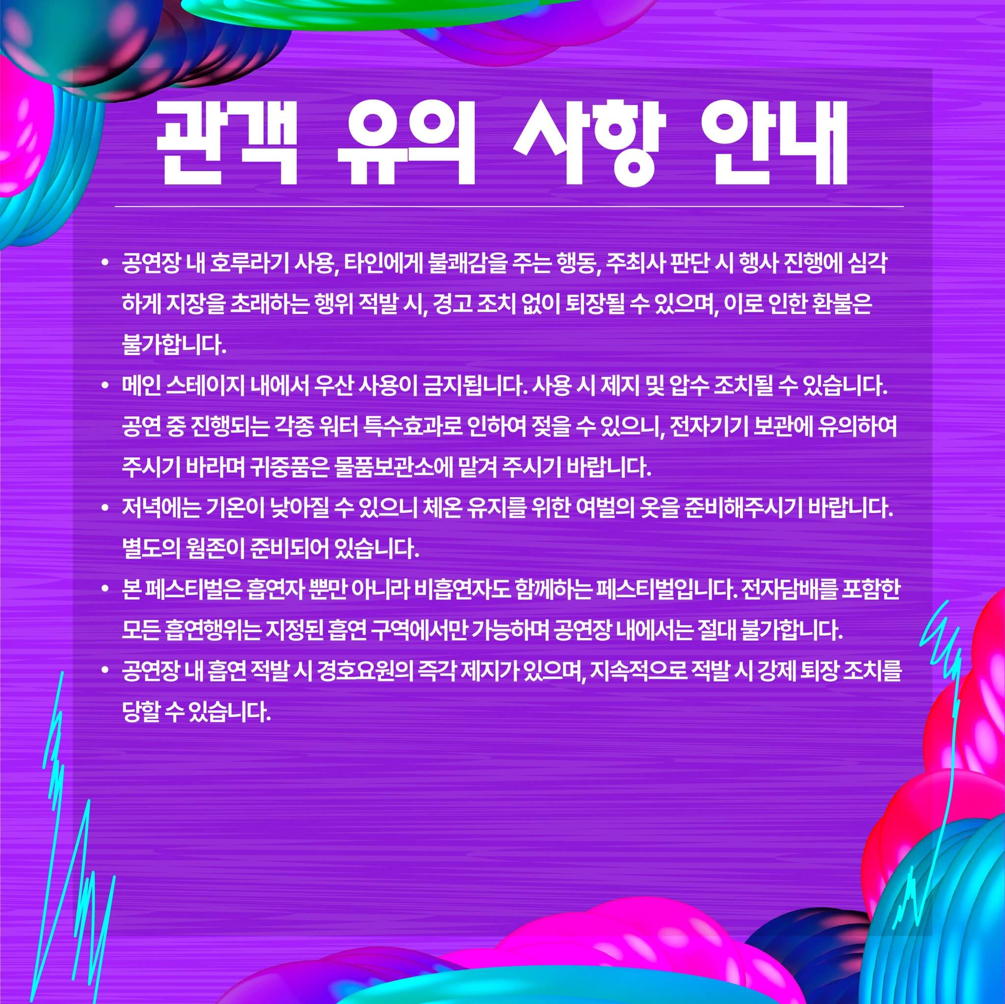 4. 본 페스티벌은 흡연자 뿐만 아니라 비흡연자도 함께하는 페스티벌입니다. 전자담배를 포함한 모든 흡연행위는 지정된 흡연 구역에서만 가능하며 공연장 내에서는 절대 불가합니다. 공연장 내 흡연 적발 시 경호요원의 즉각 제지가 있으며, 지속적으로 적발 시 강제 퇴장 조치를 당할 수 있습니다.