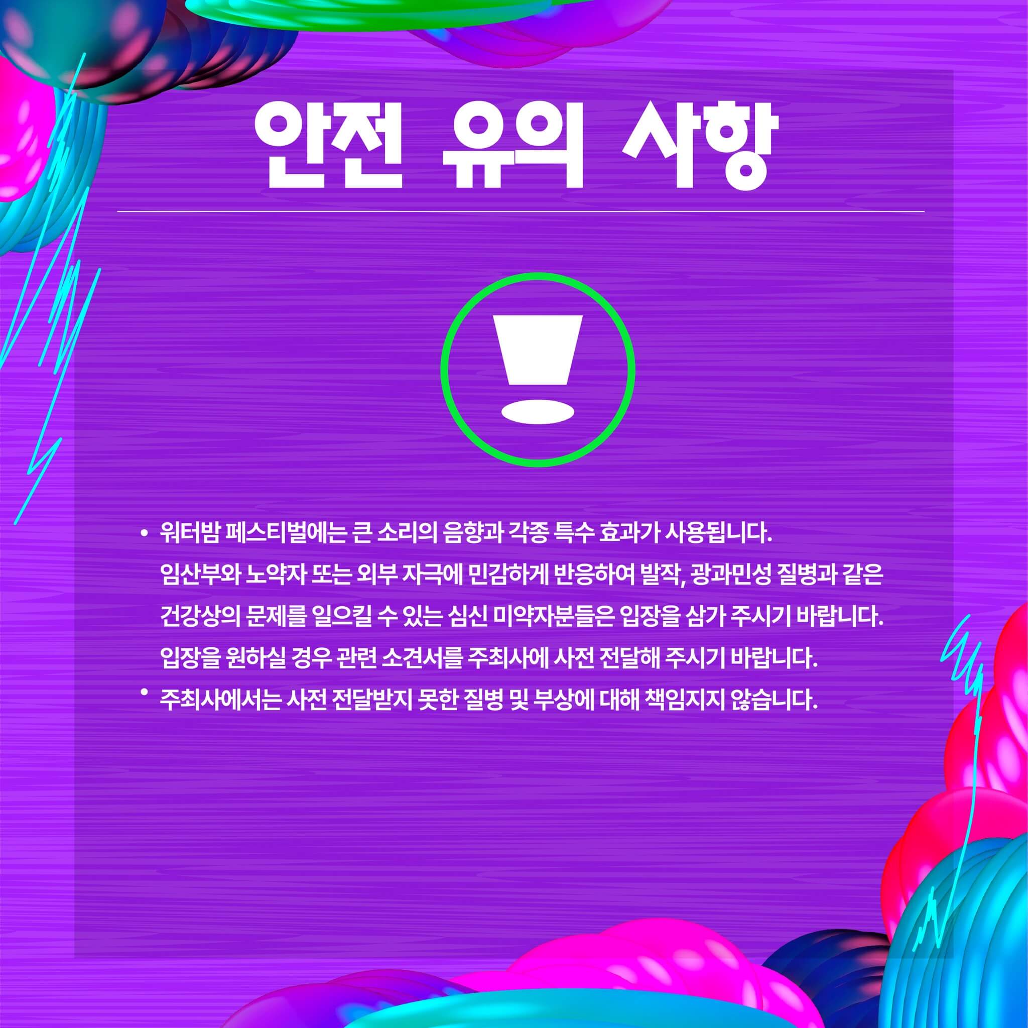 9. 안전 유의 사항 안내 : 워터밤 페스티벌에는 큰 소리의 음향과 각종 특수효과가 사용됩니다.