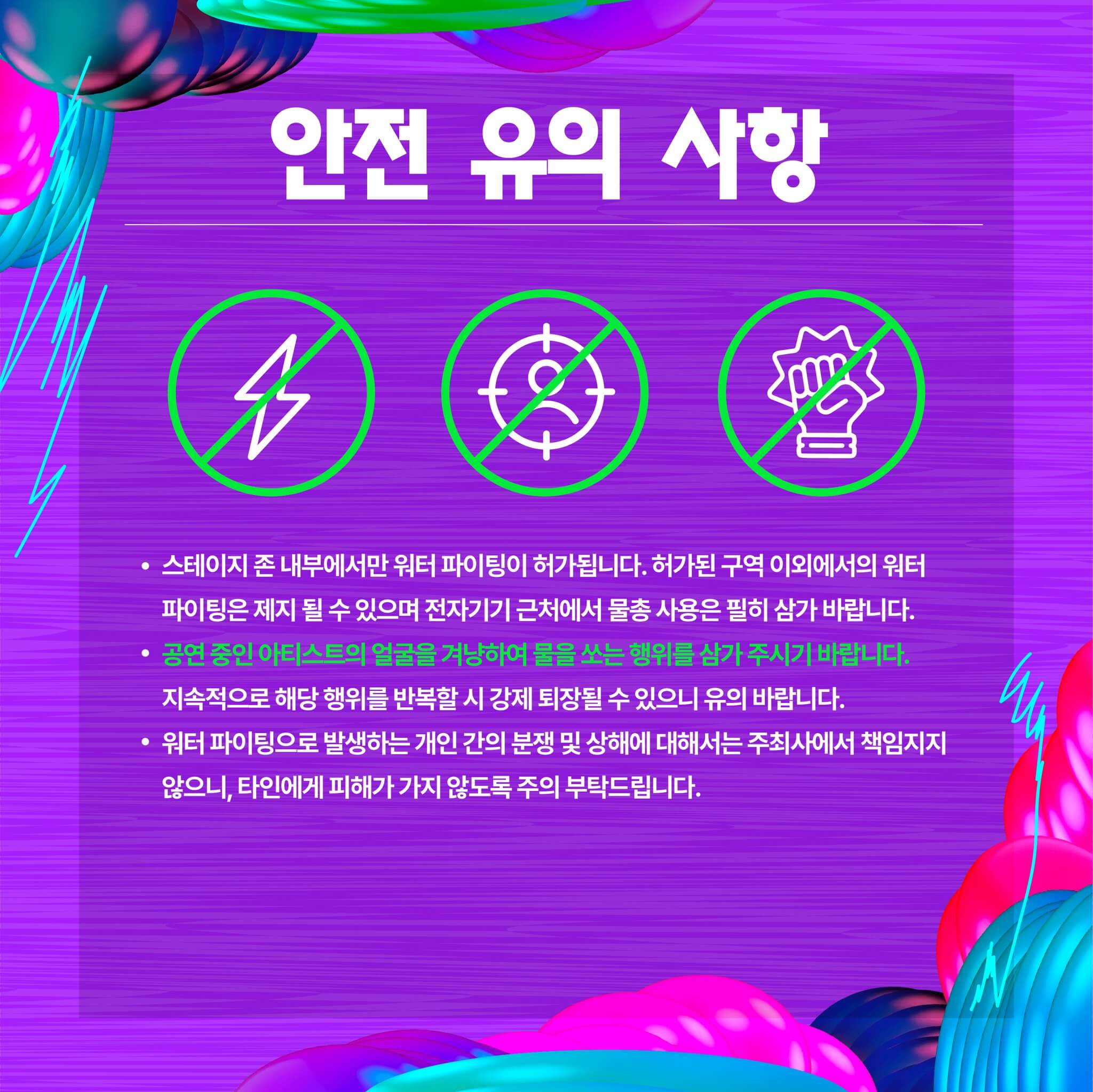 공연 중인 아티스트를 겨냥하여 물을 쏘는 행위를 삼가 주시기 바랍니다.